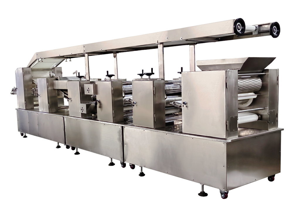 3、設(shè)備為變頻控制,每一道壓輥都采用單機驅(qū)動,通過測距傳感器,實現(xiàn)自動面帶張緊控制,多輥聯(lián)動??焖佥p松地制作大量面皮,提高生產(chǎn)效率。